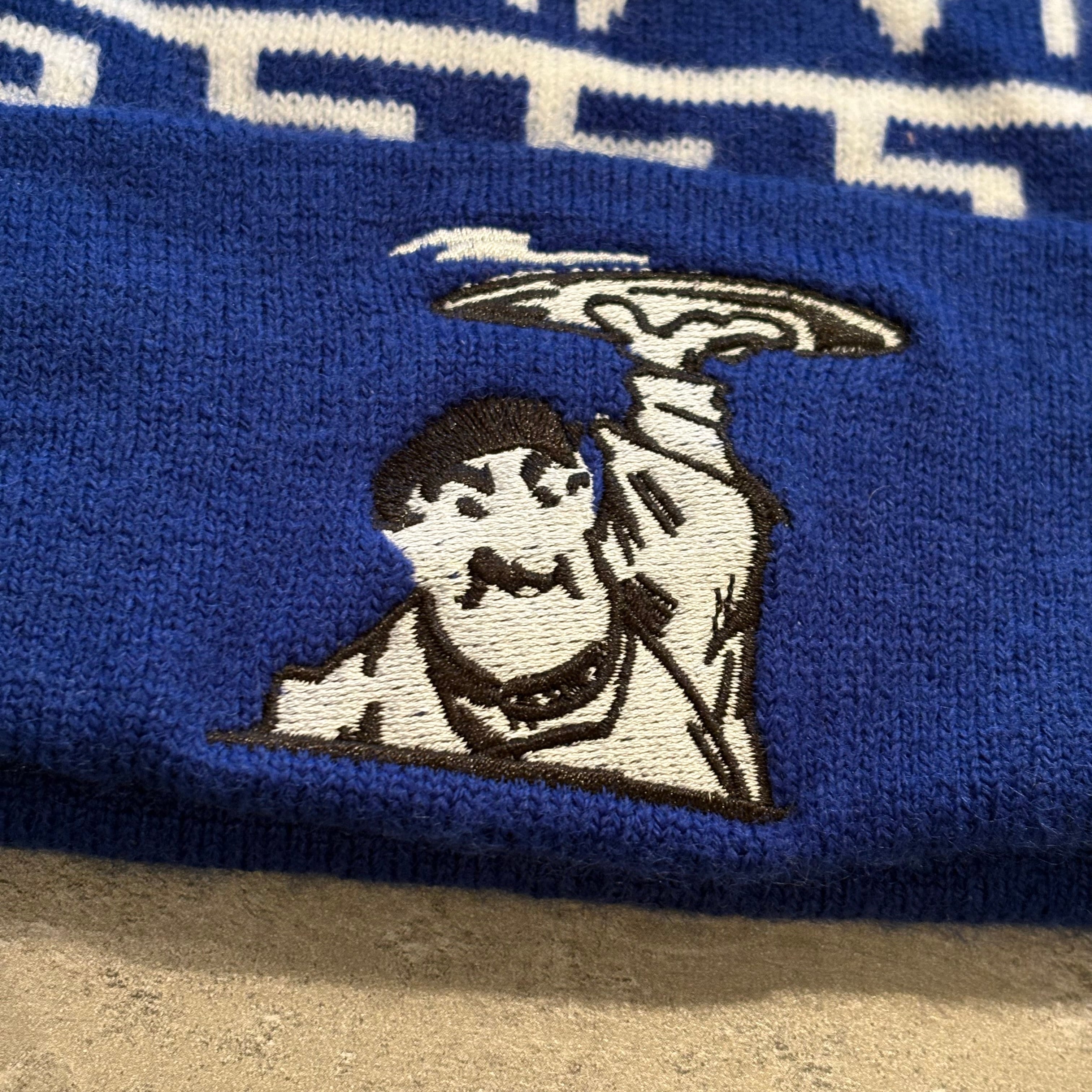 〈REMARKS〉『THE MAD GREEK』の文字が入ったポンポン付きのニットキャップ。ピザを回す男性の刺繍がかわいいです☺︎