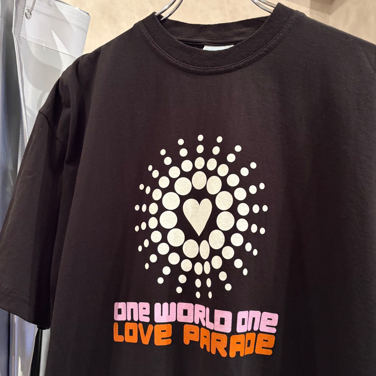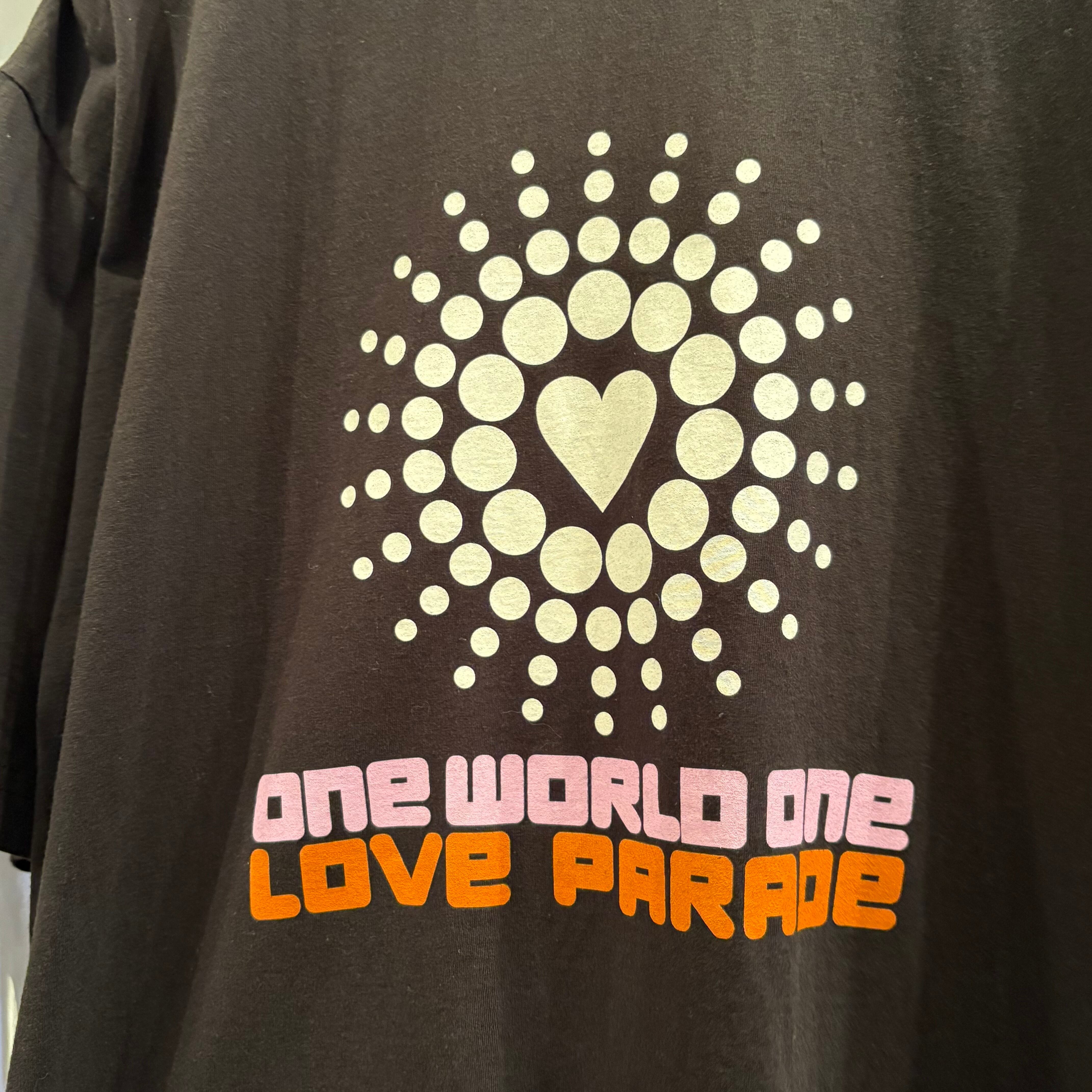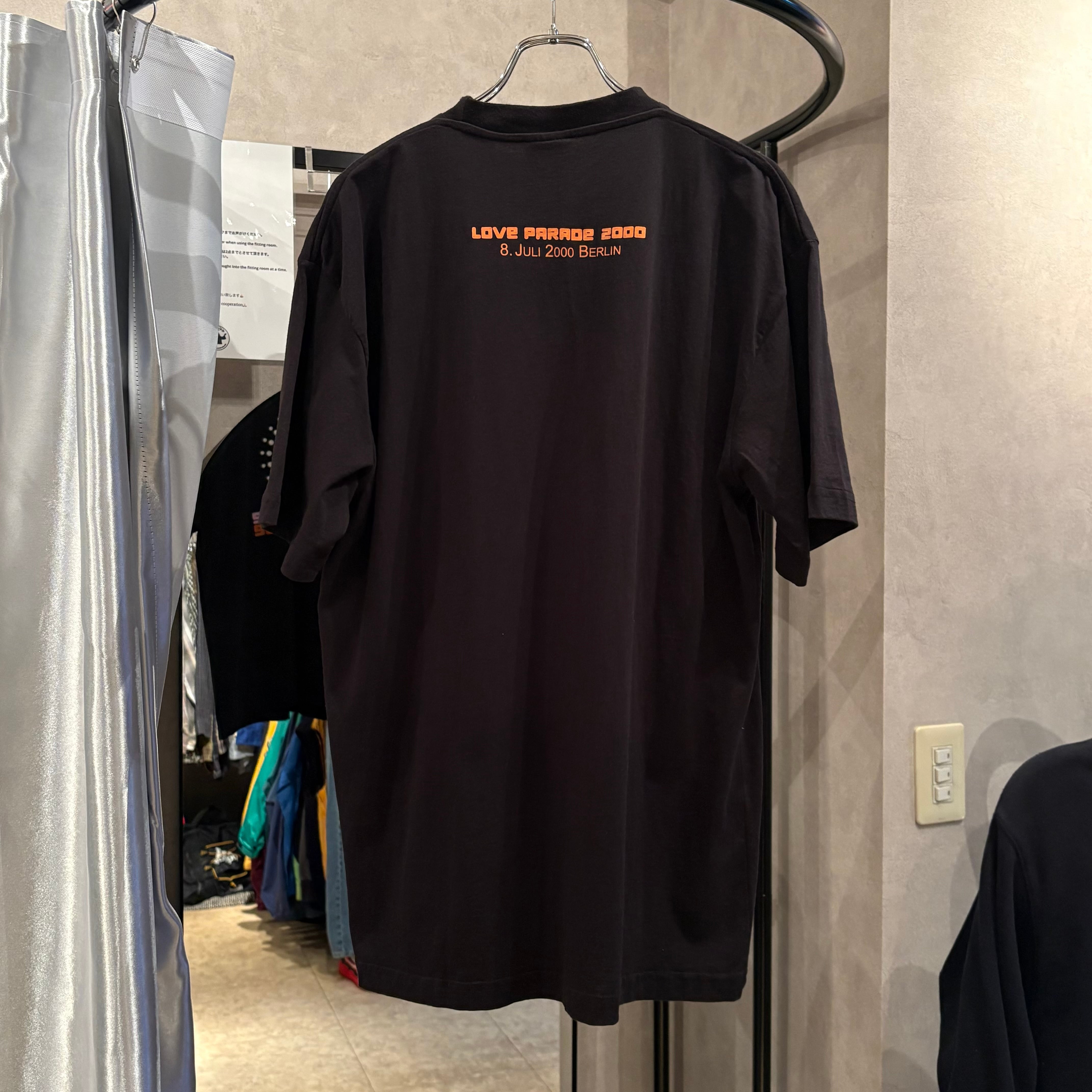 ドイツのベルリンなどで開催されていた世界でも最大級のテクノレイヴ『LOVE PARADE』の2000年のTシャツ。何年か前にはGUCCIとコラボしており、このイベントを象徴するこのアイテムと同じフロントグラフィックが落とし込まれた洋服が展開されていました☺︎