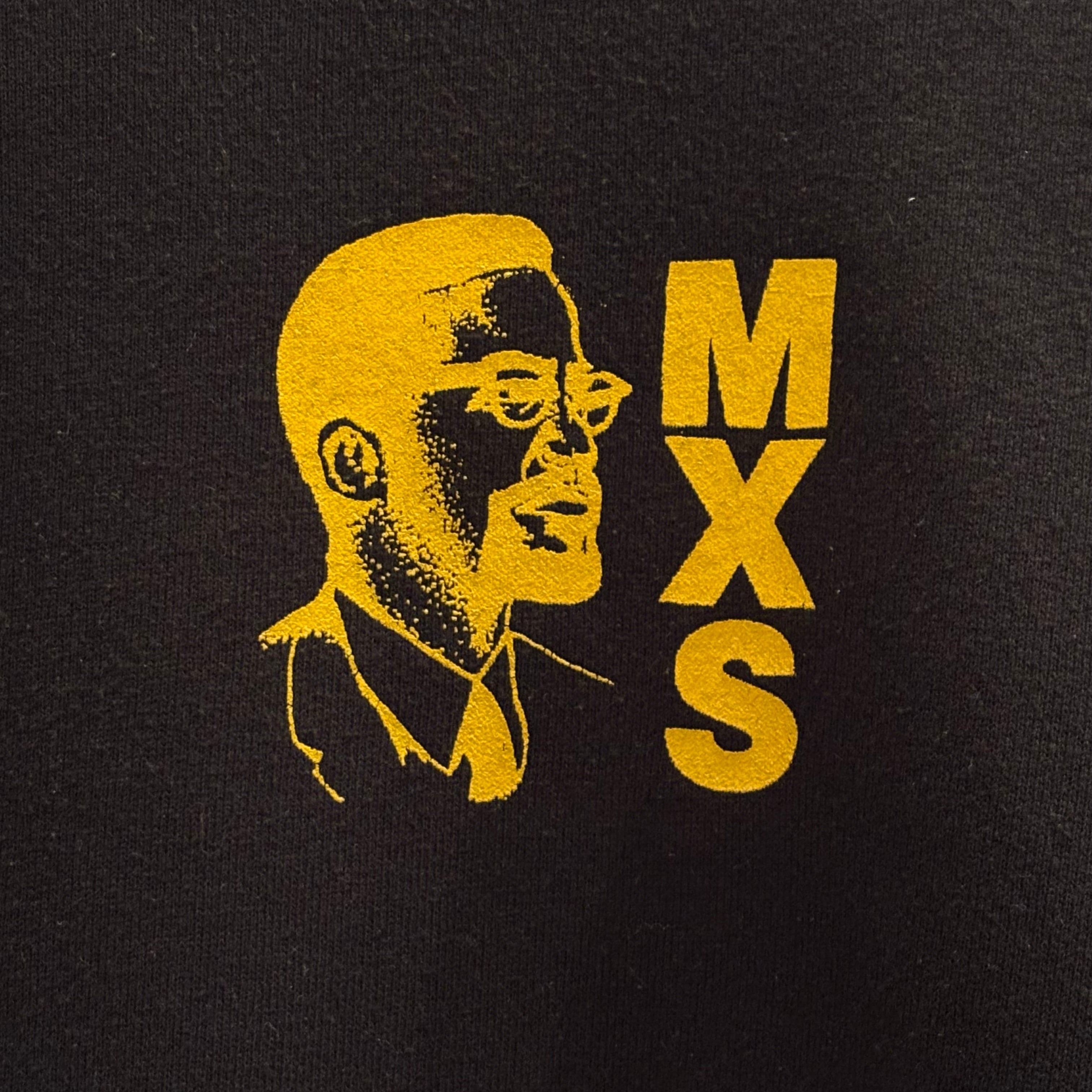 ブラックのボディにイエローのプリントが映えるコントラストの効いたデザインは胸のマルコムXの横顔含め極めて目を引く要素かと思います。