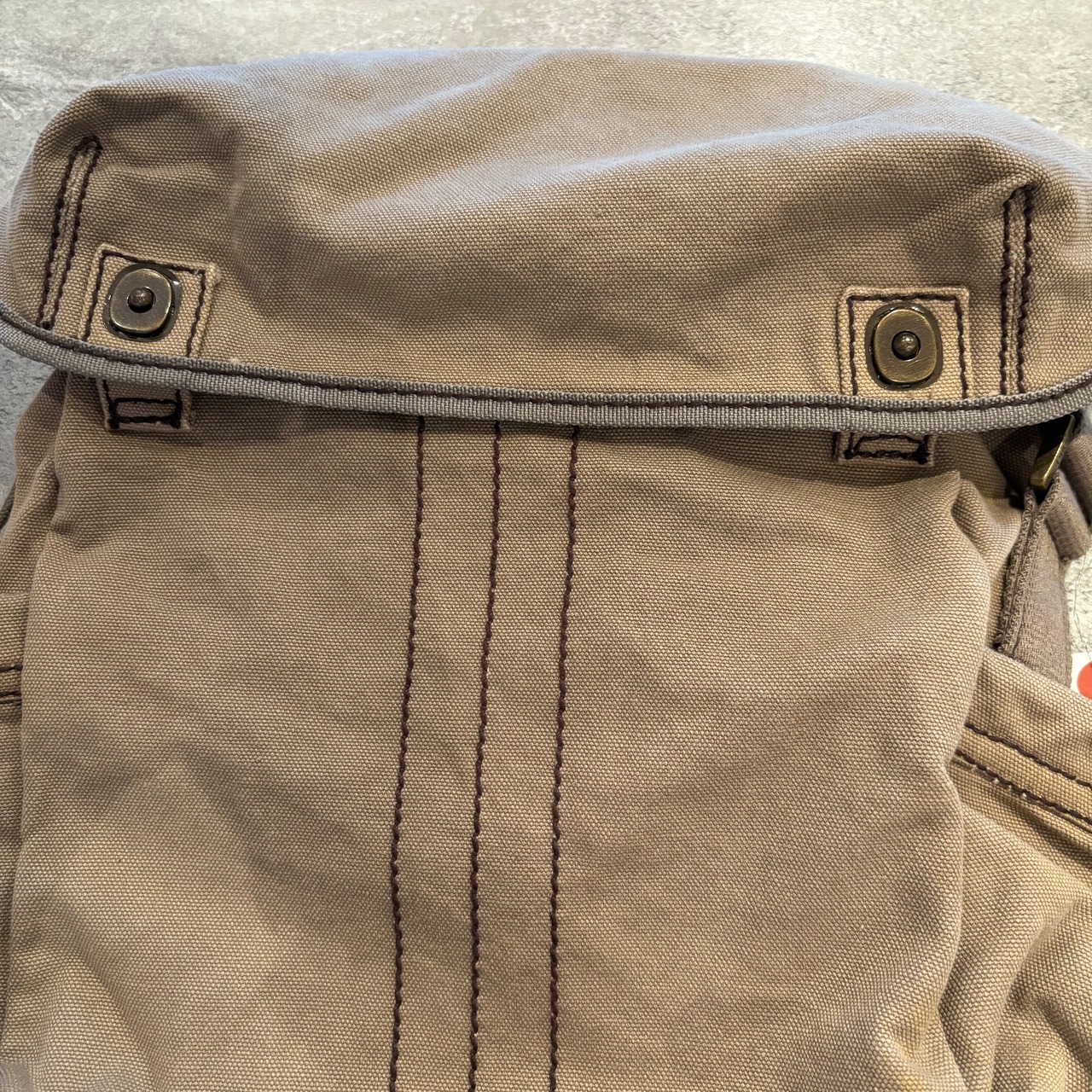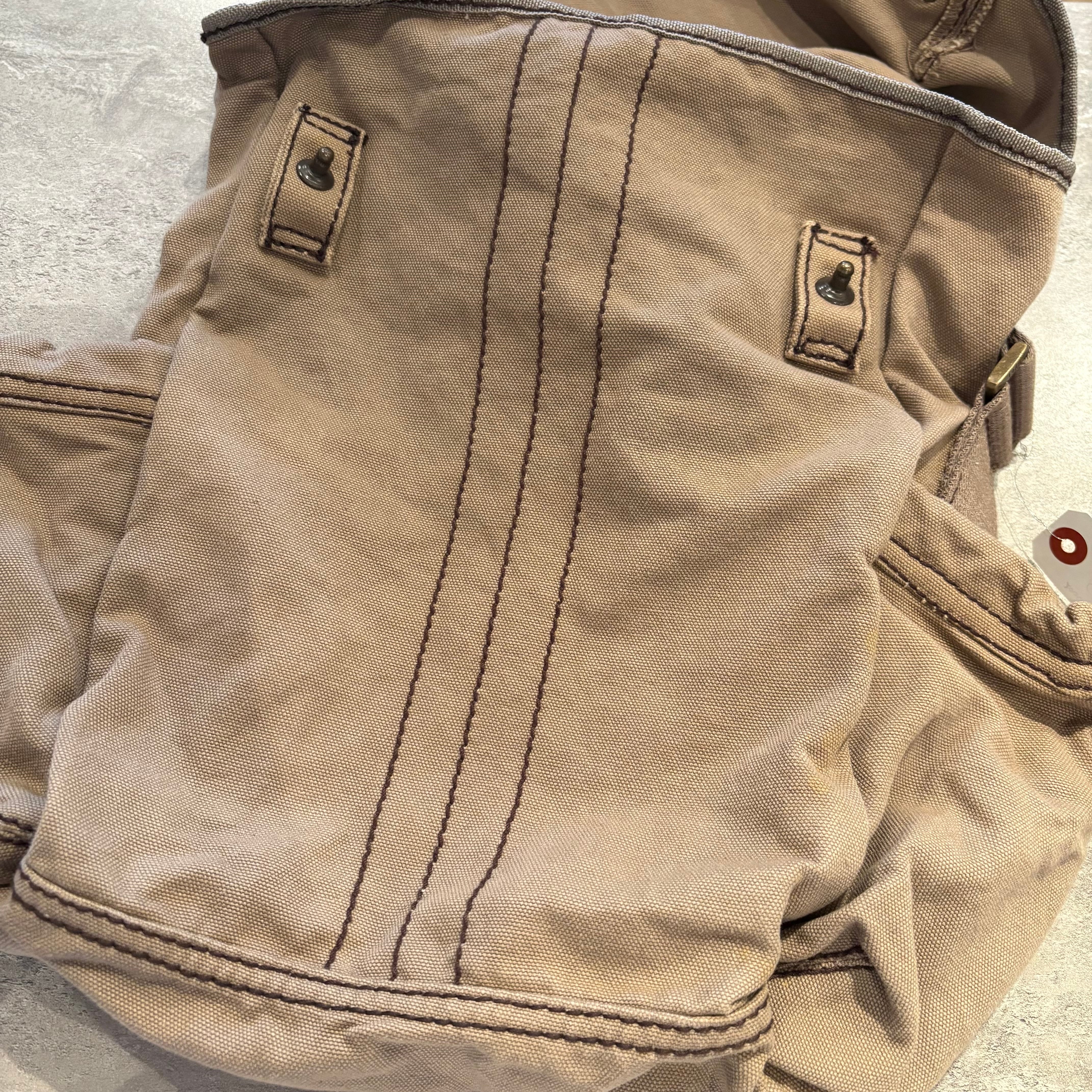 ミリタリーサンプリングのアイテムらしい武骨でタフなキャンバス生地とカラーリング、特徴的なフォルムは一見するとギャップのアイテムらしくない良い意味での意外性が感じられます。