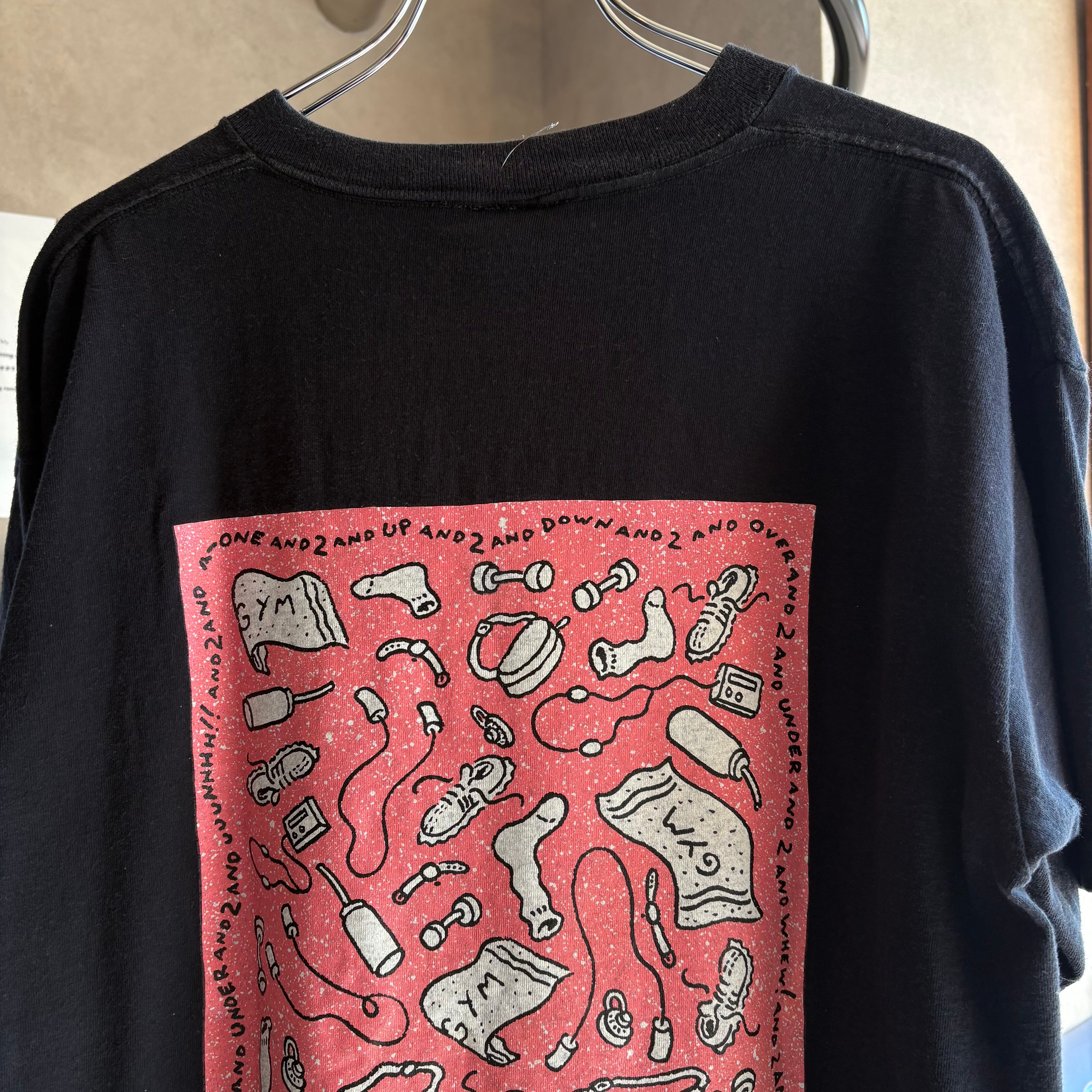 前面のストレッチで身体が伸びる様子がイラストと文字の両方で表現されたユーモラスなグラフィック、背面のスクエア型に収まったジムやエクササイズにまつわるアイテムのグラフィック、どちらもポップで魅力的な雰囲気があります。